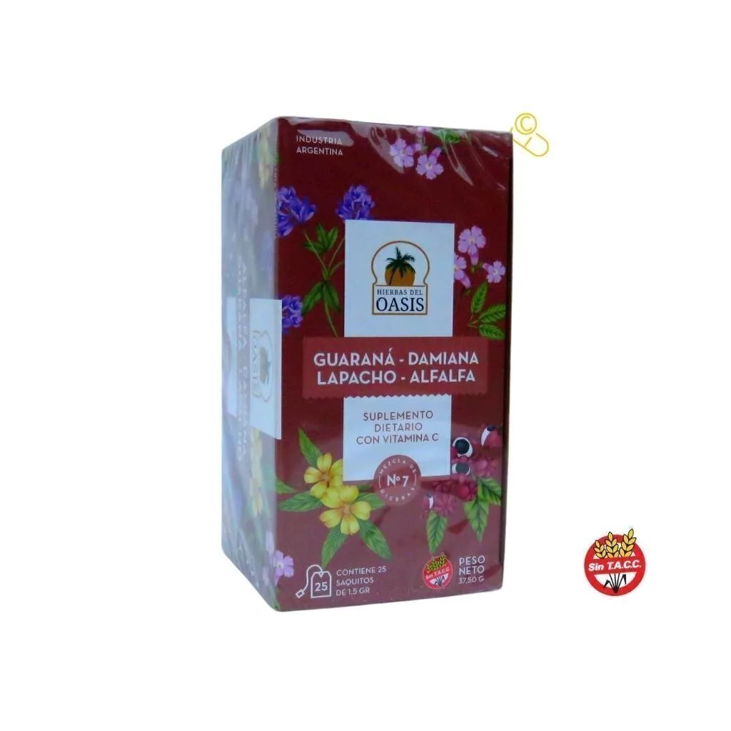 Contiene: guaraná, lapacho, damiana y alfalfa.